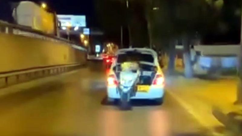 Avcılar’da arızalanan motosiklet, arka lastiği otomobilin bagajına sıkıştırılarak taşındı. Ön lastiği yolda sürüklenen motosikletle birlikte yolda ilerleyen otomobil, trafikte tehlike oluşturdu. O anlar cep telefonu kamerasıyla kaydedildi.