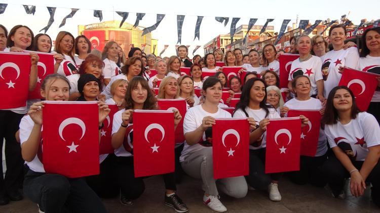 Aydın'da, Kadın hakları Koruma Derneği, Cumhuriyetin 99'uncu yıl dönümü kutlamaları kapsamında Atatürk Kent Meydanı'nda 99 kadını bir araya getirdi.