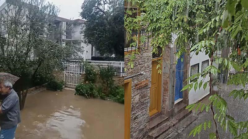 Balıkesir'in Ayvalık ilçesinde son 24 saatte metrekareye 63,8 kilogram yağış düştü. İlçede cadde ve sokaklar göle dönerken, 2 evi de su bastı.