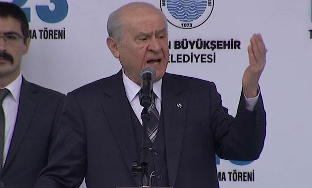 Mersin'de konuşan MHP Lideri Devlet Bahçeli, Afrin'de süren Zeytin Dalı Harekatı'nın çok yerinde olduğunu belirterek, "Afrin ile başlayan temizlik mutlaka diğer alanları da kapsamalıdır. Nerede bir terör unsuru varsa milli tehditler mutlaka imha edilmelidir" dedi.