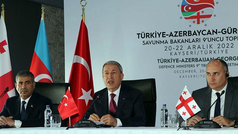 Türkiye, Azerbaycan ve Gürcistan Milli Savunma Bakanları 9'uncu toplantısı, Kayseri'de Erciyes Kayak Merkezi'nde yapıldı. Toplantıda konuşan Milli Savunma Bakanı Hulusi Akar, "Burada bizler karşılıklı bilgi ve görüş alışverişinde bulunduk. Bunun çok faydalı olduğunu belirtmek istiyorum. Azerbaycan'la olan münasebetlerimizi bilmeyen kalmadı. Biz iki devlet tek millet olarak bu anlayışla kederli ve kıvançla biz bir ve beraber olduğumuz can kardeşimiz Azerbaycan ve kardeşliğin en güzel örneğini, kardeşliklerin en güzel örneğini görüyor. Bu arada tabi tek vatan harekatıyla da Azerbaycan'ın hakkını, hukukunu savunması konusunda elimizden gelen desteği de sağladık ve bunu da bütün dünya bir kez daha gördü ve idrak etti. Diğer taraftan da Gürcistan da bizim hem ortak sınırımız var, ortak değerlerimiz var, ortak tarihimiz var. Bizim dostumuz, kardeşimiz ve sadece dostluğumuz, stratejik ortağımız kadim dostumuz ve değerli bir komşumuzdur. Kafkasya'nın gerçekten son derece önemli ve yapıcı bir rol üstlenen bir ülkedir, bir komşumuzdur. Biz burada bu üç ülkenin beraberliği oluşturduğu sinerjiyle bölgede olabildiğince, barış için, istikrar için gayretleri gösteriyoruz ve bunun da önemli bir etkisi altında hep birlikte müşahede ettik, ediyoruz. Bu zirvede, bakanlar arası toplantıda Güney Kafkasya Bölgesi konusunda ortak bir vizyonu paylaşan meslektaşlarımla beraber ülkelerimizi ilgilendiren, mevcut ve potansiyel iş birliği kollarını, geniş bir perspektifte ele aldık. Ayrıca küresel ve bölgesel gelişmelere ilişkin de bilgi ve görüş alışverişinde bulunduk" diye konuştu.