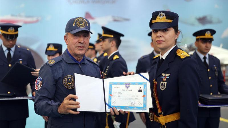 Eğitim birincisi tarafından yaş kütüğüne uçak maketi çakılması sonrası Bakan Akar ve TSK komuta kademesi, dereceye giren pilotlara brövelerini taktı.