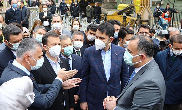 Bakan Kurum, açıklamasının ardından incelemelerine devam etti. Kurum, evini boşaltanlarla da sohbet ederek, yaşanan mağduriyetlerin giderileceğini söyledi.