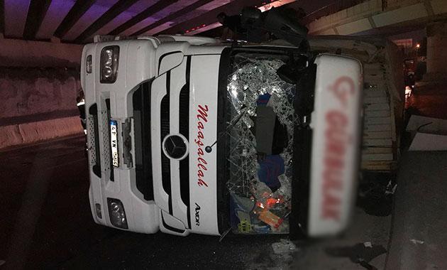 Bakırköy'de seyir halinde TIR üst geçide çarparak devrildi. Kazada 2 kişi yaralandı.