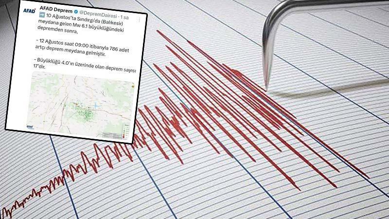 Afet ve Acil Durum Yönetim Başkanlığı (AFAD), önceki gün Balıkesir'in Sındırgı ilçesinde meydana gelen 6.1 büyüklüğündeki depremin ardından yaşanan artçılara ilişkin açıklama yaptı. Açıklamada, "10 Ağustos'ta Sındırgı'da (Balıkesir) meydana gelen Mw 6.1 büyüklüğündeki depremden sonra 12 Ağustos saat 09.00 itibarıyla 786 adet artçı deprem meydana gelmiştir. Büyüklüğü 4.0'ın üzerinde olan deprem sayısı 17'dir" denildi.