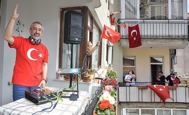 İstanbul'da sokağa çıkma yasağı nedeniyle 23 Nisan Ulusal Egemenlik ve Çocuk Bayramı, bu yıl evlerde kutlanıyor. Kadıköy Göztepe Mahallesi'nde yaşayan DJ Coşkun Gürsel, evinin balkonuna kurduğu ses sistemiyle evlerinden çıkamayan çocuklar ve komşuları için performans sergiledi. Gürsel'in komşuları da pencere ve balkonlara çıkarak çalan şarkılara alkışlar ve Türk bayrakları sallayarak eşlik etti.