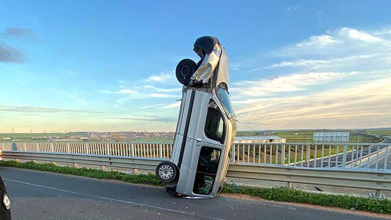 Tekirdağ'da bariyerlere çarptıktan sonra bir süre sürüklenen hafif ticari araç, dik vaziyette kaldı. Kazada araçta bulunan2 kişi yaralandı.
