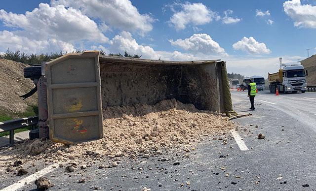 Başakşehir Kuzey Marmara Otoyolu'nda seyir halindeyken iki lastiği birden patlayan hafriyat yüklü kamyon devrildi. Sürücünün yara almadan kurtulduğu kazada kamyondaki hafriyat otoyola savruldu. O sırada otoyoldan araç geçmemesi olası bir facianın önüne geçti.