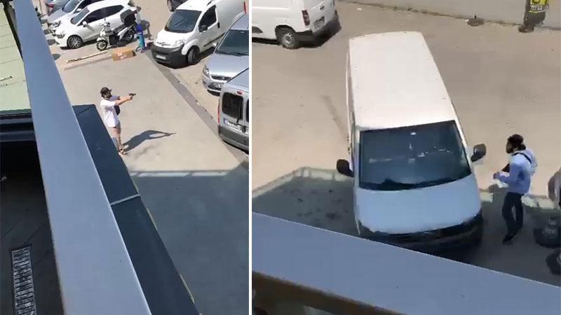 BaÅŸakÅŸehir'de iki grup arasında baÅŸlayan tartışmada, bir kiÅŸi silahla havaya ateÅŸ ederken, karşı gruptaki bir kiÅŸi park halindeki araçların arkasına saklandı. O anlar cep telefonu kamerasına yansıdı.Â