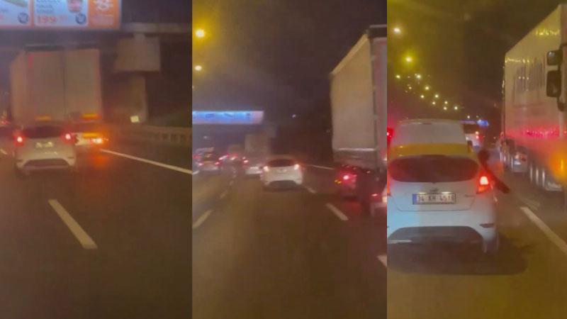 Başakşehir'de otomobil sürücüsü ve yanındaki kişi, tartıştıkları TIR şoförüne sopayla saldırdı. Seyir halinde yaşanan tartışma ve sopalı saldırıyı diğer sürücüler cep telefonu kamerasıyla kaydetti.