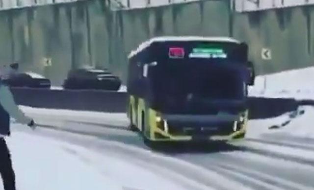 Başakşehir'de dün akşam kar yağışıyla kayganlaşan yolda araçlar zor anlar yaşadı. O araçlardan biri de İETT otobüsüydü. Virajda kayan otobüs araçlara çarpmaktan kılpayı kurtuldu. O anlar bir cep telefonu kamerasına yansıdı.