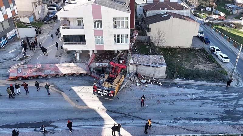 Başakşehirde yokuştan kayan TIRın dorsesi ve iş makinası binaya girdi; 2 yaralı