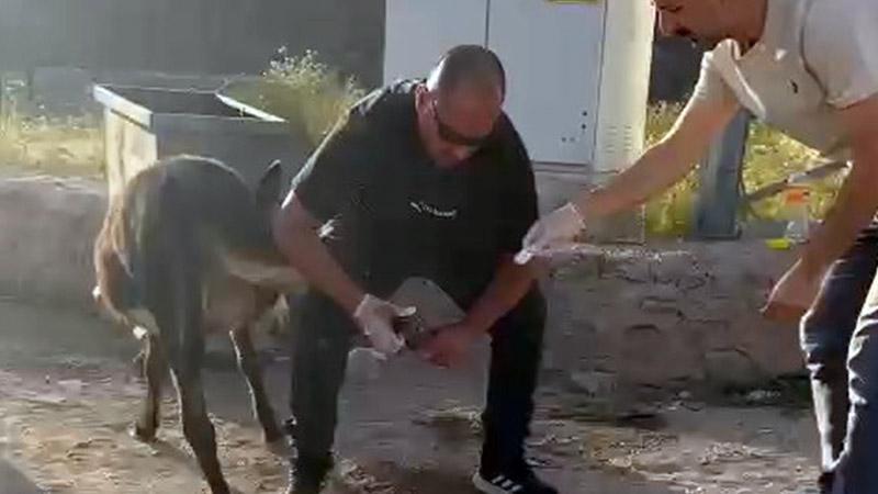 Bingöl’ün Karlıova ilçesinde Devlet Hastanesi Başhekimi Uzman Doktor Veysel Bahadıroğlu, sokakta gördüğü ayağından yaralanan eşeğe pansuman yaptı. O anlar, cep telefonu kamerasına yansıdı.