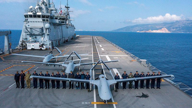PT-3 ve PT-4 kuyruk numaralı milli SİHA'lar, ikişer adet MAM-L mühimmatı yüklü şekilde TCG Anadolu'nun kısa pistinden havalandı.