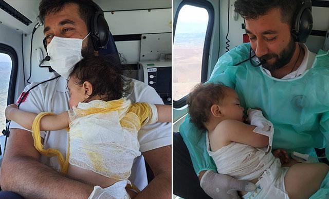 Afyonkarahisar'da, üzerine sıcak su dökülmesiyle vücudunda yanıklar oluşan 15 aylık Zeynep bebek, acil tıp teknisyeni (ATT) Mehmet Canko'nun kucağında ambulans helikopterle Eskişehir'e sevk edildi. Canko, mayıs ayında da üzerine dökülen sıcak suyla haşlanan Beril (1) bebeği aynı şekilde kucağında taşımıştı.