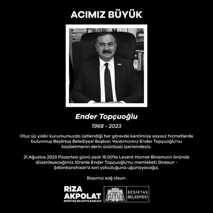 "Otuz üç yıldır kurumumuzda üstlendiği her görevde kentimize sayısız hizmetlerde bulunmuş Beşiktaş Belediyesi Başkan Yardımcımız Ender Topçuoğlu'nu kaybetmenin derin üzüntüsü içerisindeyiz. 21 Ağustos 2023 Pazartesi günü saat 15.00'te Levent Hizmet Binamızın önünde düzenleyeceğimiz törenle Ender Topçuoğlu'nu memleketi Giresun - Şebinkarahisar'a son yolculuğuna uğurlayacağız. Cenazesi 22 Ağustos 2023 Salı günü Giresun Şebinkarahisar Tekışık Camii’nde öğle namazına müteakip gerçekleşecektir."