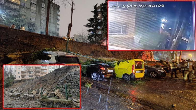 Beşiktaş’ta istinat duvarının 8 aracın üzerine yıkılması kamerada