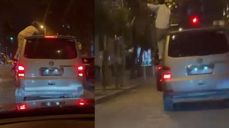 Beşiktaş Akaretler’de seyir halindeki minibüsün sürücüsü ve yanındaki kişi yüksek sesle müzik açtı. Başında kask bulunan bir kişi araç camından sarkarak dans ederken, diğer kişi de camdan dışarı çıkarak akrobatik hareketler yaptı. İki maganda, hem kendi canlarını hem de diğer sürücülerin güvenliğini tehlikeye attı. Çevreye rahatsızlık veren şüpheliler, bir süre sonra gözden kaybolurken diğer sürücüler o anları cep telefonu kamerasıyla kaydetti.