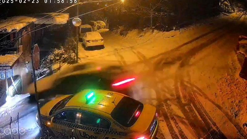 Kaza anı güvenlik kamerası tarafından saniye saniye kaydedildi. Görüntülerde buzlanan yolda kornaya basarak hızla ilerleyen otomobilin taksiye çarptığı anlar görüldü. Bu sırada taksinin direksiyon kabininde bulunan şoför, kendini aşağı atarken, çevredekiler yardıma koştu.