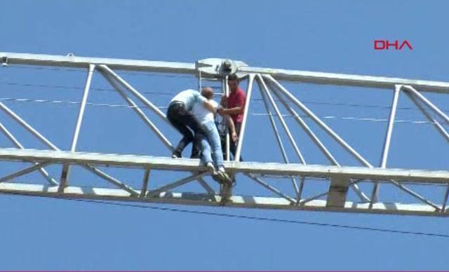 İnşaat firması yetkililerince defalarca aranmalarına rağmen kararlarından dönmeyen işçilerden ikisi, vincin ucuna kadar giderek bir süre orada oturdular.
