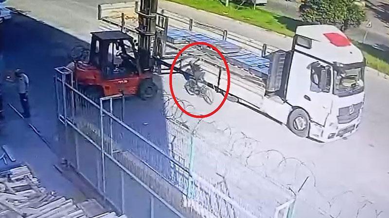 Bisikletiyle ilerlerken forkliftin çatalına çarpıp ağır yaralandı; kaza anı kamerada