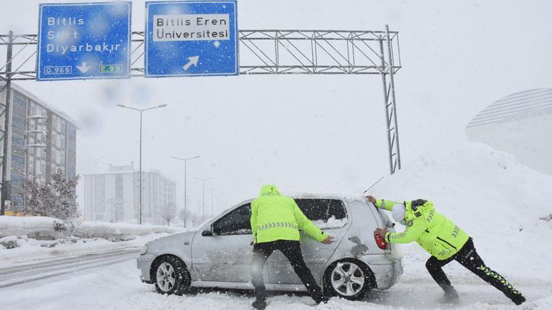 Kar kalınlığının 1,5 metreyi aştığı Bitlis'te en büyük sıkıntı, ulaşımda yaşanıyor. Ana yollarda Karayolları, mahalle aralarında belediye, köy yollarında ise İl Özel İdaresi ekipleri yolları açmak için çalışırken, 24 saat görev yapan trafik polisleri de kar yağışı ve soğuk havada sürücülere yardım için bazen zincir takıyor bazen de araçları iterek trafik akışını sağlıyor.