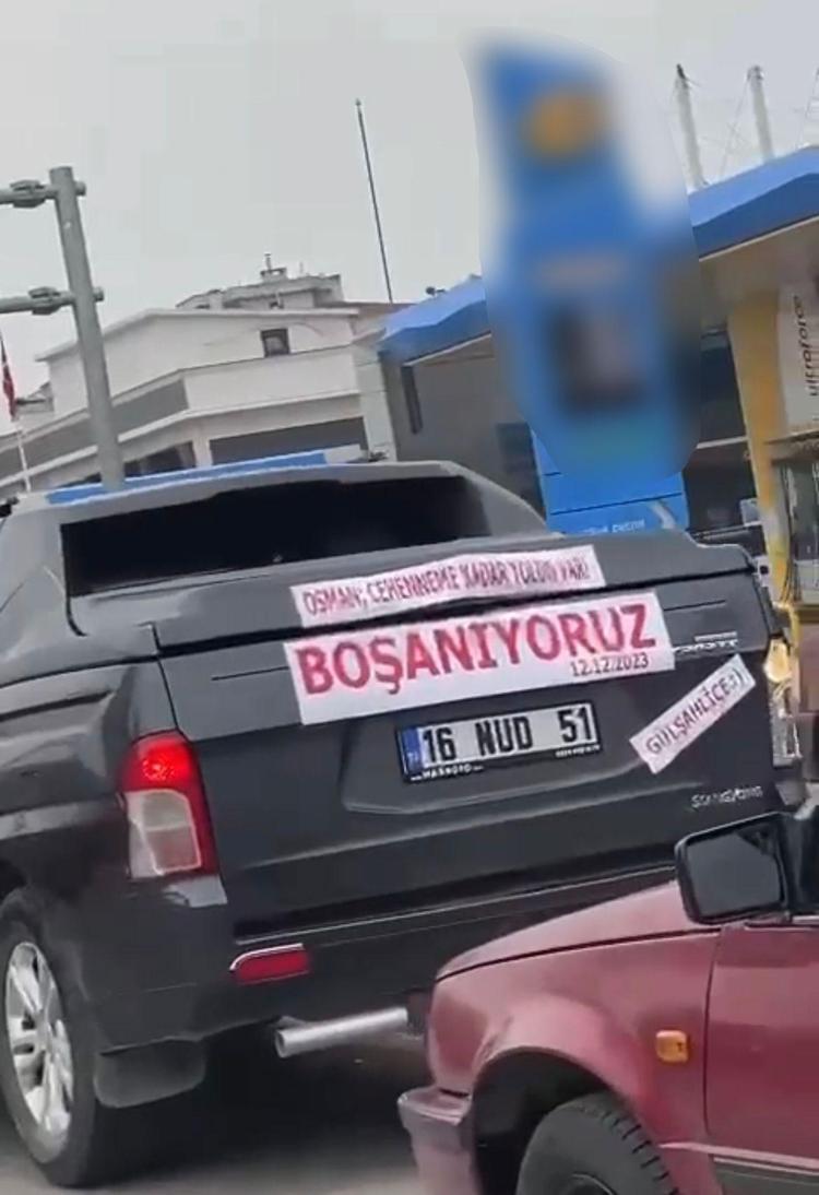 Bursa'da Gülşah A.(29), boşanma davasına gelin arabası gibi süslediği ve üzerine 'Osman, cehenneme kadar yolun var' ile 'Boşanıyoruz', yazdırdığı aracıyla geldi. Cadde ve sokaklarda tur atan Gülşah A., "Yol boyunca insanlar korna çaldı, video çekti, alkışladı, tebrik etti ve konvoy oluşturduk. İnsanlar çok pozitifti. Bu kadar büyüyeceğini düşünmemiştim" dedi.