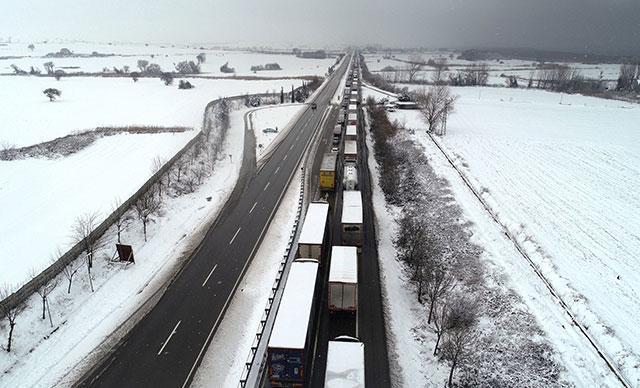 Fırtına ve kar yağışı sebebiyle sürücüler zor anlar yaşadı. Trafiğin durma noktasına geldi Bursa-İzmir Karayolu'nda yaklaşık 15 kilometrelik araç kuyruğu oluştu. Trafik, dronla havadan görüntülendi.