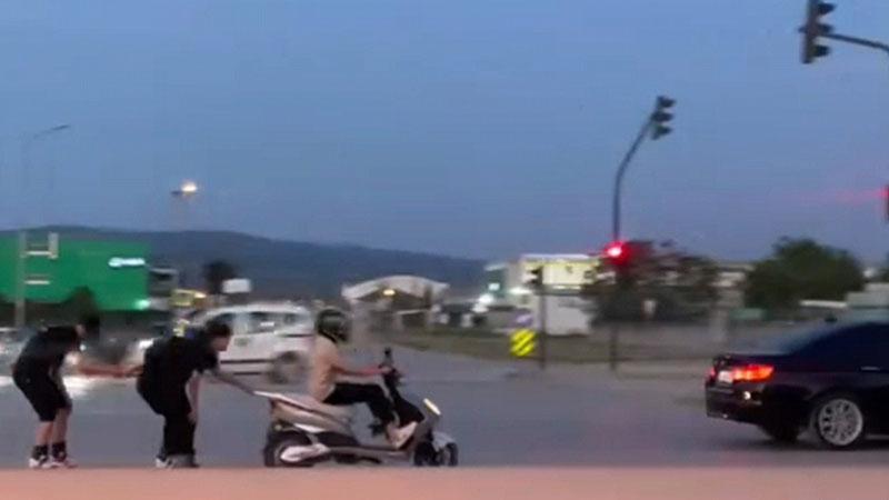 Bursa'nın İnegöl ilçesinde, patenli 3 genç seyir halindeki bir motosikletten destek alan arkadaşlarına art arda tutunarak yolculuk yaptı. Gençlerin bu tehlikeli yolculuğu, çevredeki vatandaşlar tarafından cep telefonu kamerasıyla kaydedildi.