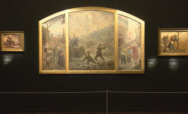 "Burada İsmail Hakkı Bey'in eseri dışında, özellikle 1918'de Viyana'da sergilenen bir tablo da var. 1918 Viyana Sergisi, Türk Ressamlarının toplu halde yurt dışında oluşturdukları ilk sergi. Artık sanat da önemliydi. Osmanlı Devleti, birçok sanatçıyı, fotoğrafçıyı, edebiyatçıyı Çanakkale'ye göndermişti. Onlar da Çanakkale Savaşı'nın aşamalarını eserleri ile belgelemişlerdi. Gerek tablo, gerek fotoğraf, gerek edebiyat alanında Çanakkale Savaşı'nın yansımaları oldu. Bu eserler de sanat değerleri dışında, belge değerleri ile önemli. Bu eserler arasında özellikle Türk Ressamı Mehmet Ruhi Arel'in 'Ayrılık ve Zafer' konulu eseri oldukça önemli. İlk defa bir Türk ressamı tablosunu 3 bölüm halinde öyküleştirmişti. Sağdan sola şeklinde, Türk askerinin ailesiyle vedalaşması ve davullarla, zurnalarla savaşa gitmesi, sonra kahramanca savaşması, sonra da yine askerimizin davullarla, zurnalarla köyüne dönüşü ve ailesine kavuşmasını görüyoruz. Vatan kurtulmuş, ailesi kurtulmuş, askerimiz de sapa sağlam dönmüştü. Birçok arkadaşı da şehit olmuştu ama artık evi yoktu. Evinin yıkılmış olduğunu görüyoruz."