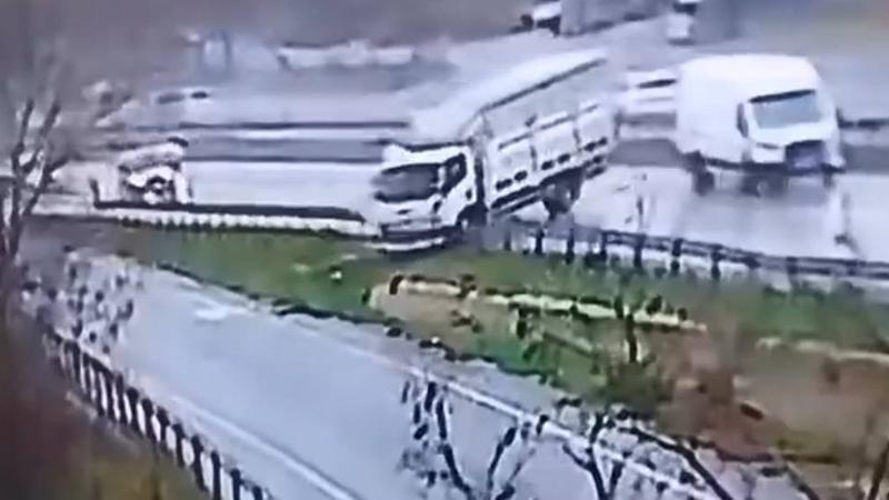 Büyükçekmece'de yağışlı hava nedeniyle sürücüsünün direksiyon hakimiyetini kaybettiği kamyon önce yan şeritte ilerleyen panelvana ardından bariyerlere çarparak kaza yaptı. Kaza anları güvenlik kamerasına saniye saniye yansıdı.