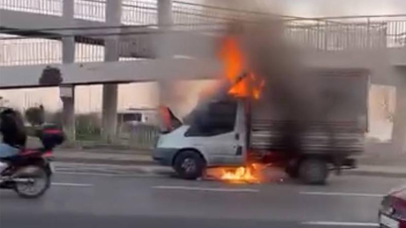 Büyükçekmece, D-100 karayolunda kamyonette çıkan yangın söndürüldü. Alevlerin sardığı araç metal yığınına dönerken yangını çevredeki sürücüler cep telefonu kamerasıyla kaydetti.