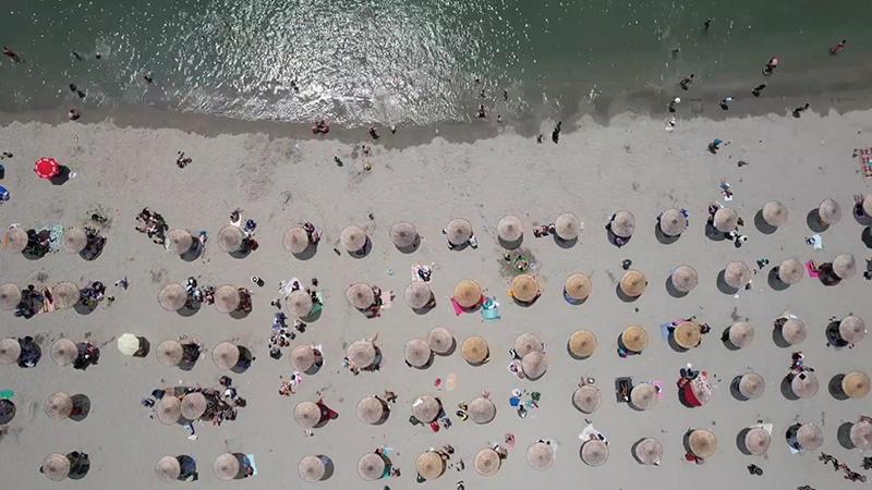 Kurban Bayramını'n 2'nci gününde İstanbul'da kalanlar sıcak havayı da fırsat bilerek plajlara akın etti. Büyükçekmece'deki plaj havadan görüntülendi.