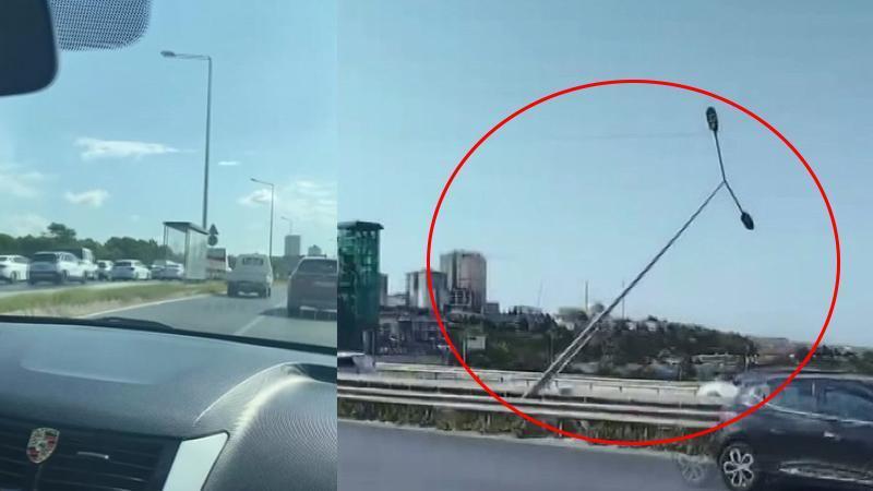 Büyükçekmece'de şiddetli rüzgar nedeniyle aydınlatma direği yan yattı: D-100'de trafik durdu