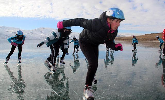 Buz tutan Çıldır Gölü'nde sürat pateni antrenmanı
