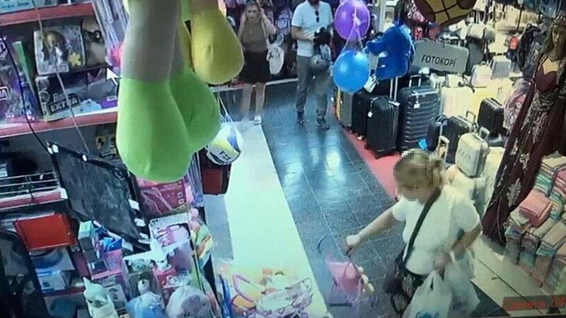 Olay, Efeler ilçesi Doğu Gazi Bulvarı Vardar iş hanında yaşandı. Dükkanını kızına emanet edip giden Fatih Cem Akça (43), kapanış saatine yakın iş yerine geri döndü. Akça, malzemeleri içeri alırken bebek arabalı bir oyuncağın eksik olduğunu fark etti. Dükkandan ayrıldığı saatten itibaren kameraları inceleyen Akça, bir kadının, iş yerinin önünden geçerken oyuncağı aldığını, kasiyer kızın fark etmemesi için kutuların arkasına sakladığını fark etti.