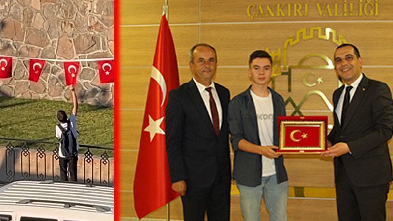Çankırı Valisi Taşolar, rüzgardan ters dönen Türk bayraklarını düzelten Mert’e teşekkür etti