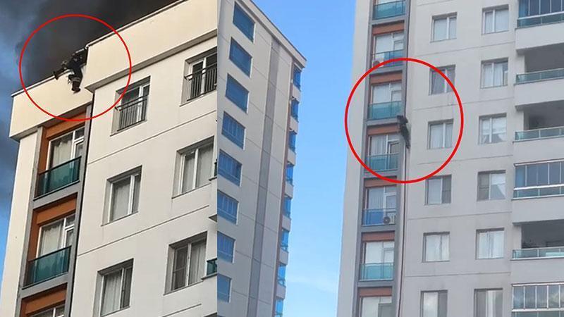 Yangın kısa sürede büyürken, apartman sakinleri evlerini tahliye etti. Olay yerine gelen polis ekipleri binanın çevresini boşaltırken, itfaiye erleri de yangına müdahale etti. Çatıya çıkan itfaiye görevlisi H.E., hızla yayılan yangında alevlerin arasında kaldı. Mahsur kalan görevli H.E., kendisine uzatılan itfaiye hortumuna tutunarak 11 katlı binanın çatısından aşağıya doğru inmeye çalıştı. Bu sırada eli hortumdan kayan H.E., metrelerce yükseklikten düştü. O anlar cep telefonu kamerasına yansırken, H.E. yapılan ilk müdahalesinin ardından hastaneye kaldırıldı. H.E.’nin ayaklarının kırıldığı öğrenildi.