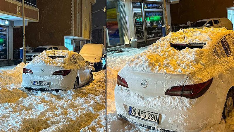 Çatıdan düşen kar kütlesi, park halindeki otomobile zarar verdi