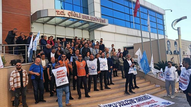 Çiğli Belediyesi'nde Tüm Bel-Sen İzmir 2 No’lu Şube'ye bağlı memurlar, geriye dönük TİS ve sosyal haklarını alamadıkları gerekçesiyle 24 Ekim'de 1 gün süreyle iş bıraktı. Belirli aralıklarla belediye binası önünde bir araya gelen memurlar, bugün de seslerini duyurmak için toplandı.