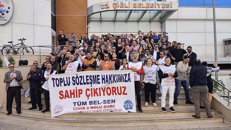 İzmir'in Çiğli Belediyesi'nde, Tüm Bel-Sen İzmir 2 Nolu Şube'ye bağlı memurlar, geriye dönük Toplu İş Sözleşmesi (TİS) ve sosyal haklarını alamadıkları gerekçesiyle belediye binası önünde bir araya geldi. Tüm Bel-Sen İzmir 2 Nolu Şube Başkanı Nihat Filiz, "Ekim ayında yarım yatırılan TİS alacağımızın hemen hesaplarımıza yatırılmasını, ağustos ayından itibaren ödenmeyen TİS alacaklarımızın da somut ve uygulanabilir bir plan dahilinde ivedilikle ödenmesini istiyoruz" dedi.
