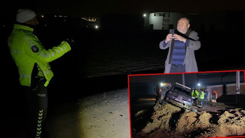 Cipi topraÄŸa saplanan alkollü sürücü polisi görünce kaza yerini kameraya kaydedip, kendini savundu