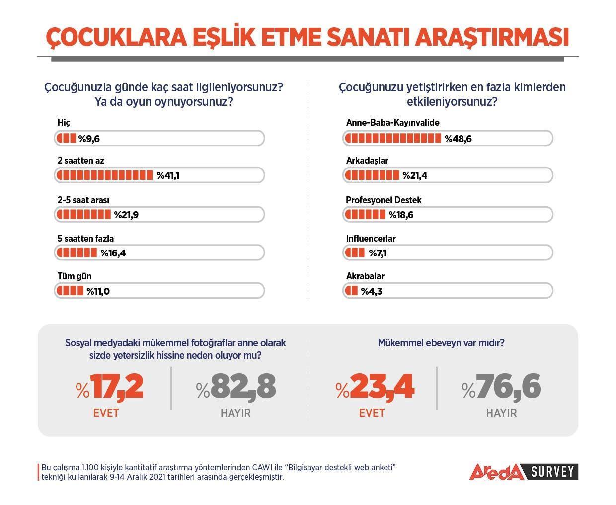 Araştırma şirketi Areda Survey’in çocuk-ebeveyn ilişkisine yönelik yaptığı çalışmada, teknolojinin aile içi iletişimimizdeki etkisi, anne ve babaların çocuğun karakterine etkisi ve mükemmel ebeveynlik soruları CAWI yöntemiyle bin 100 kişiye yönlendirildi. Aile Danışmanı ve Yazar Hilal Çorbacıoğlu’nun sonuçlarını yorumladığı araştırmada Türkiye’nin çocuk yetiştirme algısı üzerine ilginç bulgular ortaya çıktı.