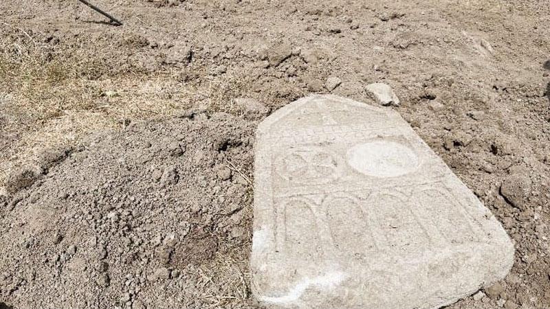 Çorum'un Alaca ilçesinde yapılan kanal kazısı çalışması sırasında tarihi değere sahip olduğu değerlendirilen, üzerinde haç motifleri yer alan mezar taşı bulundu.
