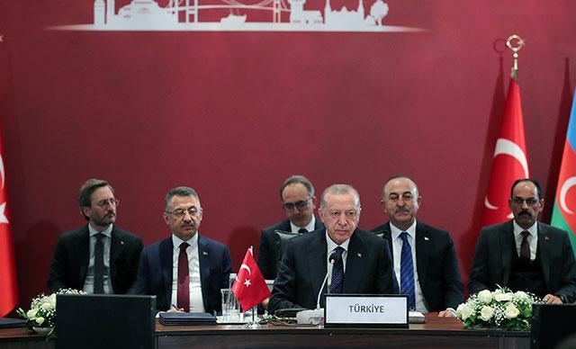 Erdoğan, "Zirvemizin teması, 'Yeşil Teknolojiler Ve Dijital Çağda Akıllı Şehirler', çevre kirliliği ve iklim değişikliyle mücadele konularında Türkiye olarak daima hassasiyet gösterdik. Paris İkilim Anlaşmasını onaylayıp yürürlüğe koyarak iklim değişikliğiyle mücadele ve uyum noktasında yeni bir dönemin kapılarını açtık. Dönem başkanlığımız süresince bu küresel meselede çok taraflı işbirliğinin geliştirilmesi için yoğun çaba harcayacağız. Bu adımlarımız bölgemizin dijital çağda çevreye en duyarlı şekilde inkişafı için uzun soluklu bir çabanın ilk adımı olarak görüyoruz. Önümüzdeki süreçte şehirlerimizi, yeni teknolojileri ve yenilikçi yaklaşımları kullanarak akıllı şehirlere dönüştürmeliyiz. Akıllı şehir çözümlerinin temelini veri odaklı stratejiler ve bu stratejilerin üretimi ileri düzeyde teknolojiler oluşturacaktık. Ulusal yapay zeka stratejimizi geliştirerek bu doğrultuda bir üst aşamaya çıkacak adımı attık. Stratejimizi teşkilatımıza da teşmil ederek müşterek bir saydam ve katılımcı yapay zeka portalının tesisi için çalışmaya başlayalım istiyoruz. Teşkilat olarak bu konularda ortak politikalar geliştirmeli ve dijital dönüşüme liderlik etmeliyiz. Dijital dönüşümün yol haritasını belirlemeliyiz. Bu doğrultuda tüm paydaşlarla birlikte insan odaklı ortak stratejik planlar oluşturmalı dijital dönüşümün yol haritasını belirlemeliyiz. Yeşil büyümeye yönelik ortak projelere birlikte imza atmalıyız. Akıllı şehircilik alanında işgalden azad edilen Zengilan'daki atılım Türkistan'ın, Budapeşte'deki uyulmalar, Kırgızistan ve Özbekistan'daki çalışmalar takdire şayandır. Karşı karşıya kaldığımız bir diğer hakikat ise küresel ısınmanın da etkisiyle doğal afetlerin sayısının ve yıkıcı sonuçlarının artmasıdır. Yaz aylarında yaşadığımız büyük yangınların söndürülmesinde bizimle dayanışma gösteren tüm dost ülkeler teşekkür ediyorum.