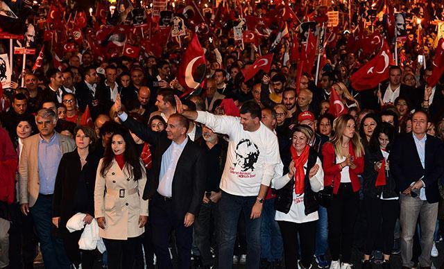 Fener Alayı görüntülerini kutlamaya katılanlardan caddeye yerleştirilen dev ekranlardan izledi. Suadiye Işıklar’da 19.00’da başlayan yürüyüş Caddebostan İskele Sokak’ta son buldu. Cumhuriyet yürüyüşüne, Kadıköy Belediye Başkanı Şerdil Dara Odabaşı ve eşi Rojvan Odabaşı, CHP Genel Başkan Yardımcısı Onursal Adıgüzel, CHP İstanbul Milletvekilleri Akif Hamzaçebi, Gürsel Tekin, eski Kadıköy Belediye Başkanları Aykurt Nuhoğlu ve Selami Öztürk katıldı. Cumhuriyet tırından kalabalığa seslenen Kadıköy Belediye Başkanı Şerdil Dara Odabaşı, “Her yıl büyük bir onurla katıldığım bu yürüyüşe, bugün Kadıköy Belediye Başkanı olarak katılıyorum. Belediye Başkanı olmak için göreve talip olduğumda, Kadıköy’ü İstanbul’un, hatta Türkiye’nin gözbebeği bir kent yapan değerleri anlatmış, bu değerlere sahip çıkıp, daha da çoğaltacağımızın sözünü vermiştim. ‘Daha Çok Kadıköy’ demiştik. O zaman, ulaşabildiğim kadar çok komşuma ulaşmaya çalışmıştım. Şimdi bu fırsat yeniden elime geçti. Kadıköy’ün değerlerini yaratan çağdaş, Atatürkçü, özgürlükçü, Cumhuriyet değerlerine bağlı, aydınlık yüzlü yüz binlerce komşum hemen yanı başımda. O sözü şimdi hepinizin huzurunda bir kez daha veriyorum. Kadıköyümüz, daha güçlü, değerlerine daha tutunmuş, yeni nesillere aktardığı Atatürk ilkeleriyle her zaman örnek bir ilçe olmaya, Cumhuriyetin ve özgürlüklerin kalesi olmaya devam edecektir” şeklinde konuştu.