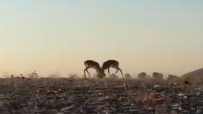 Hatay'ın Kırıkhan ilçesinde iki erkek dağ ceylanının (gazella gazella) kafa kafaya verdiği mücadele, cep telefonuyla görüntülendi.