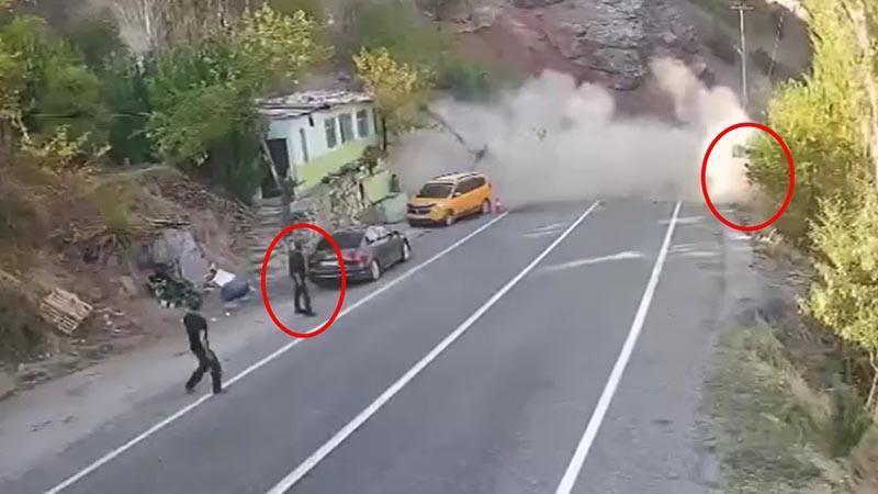 Tunceli'de yol kenarında bekleyen taksi şoförü, dağdan kopan kaya parçalarının altında kalmaktan başka birinin ‘Kaç’ uyarısıyla son anda kurtuldu. O anlar, güvenlik kamerasına yansıdı.