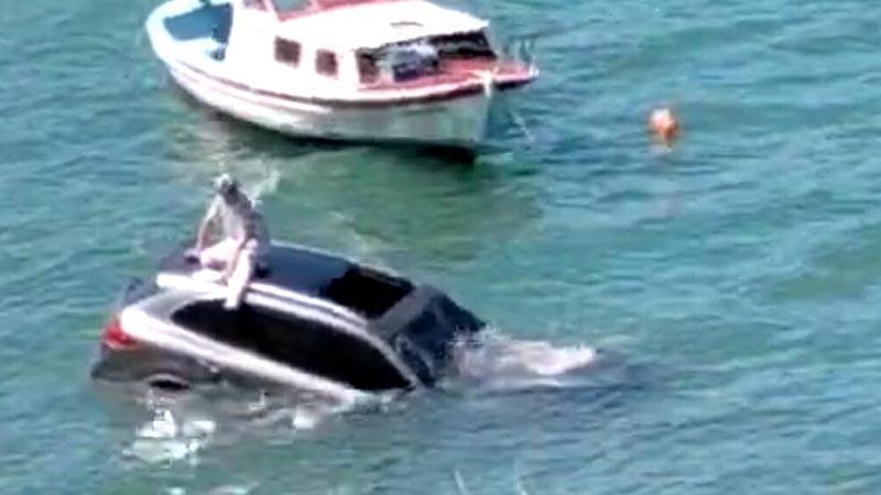 Denize uçan otomobilinin üzerinde oturup yardım bekledi