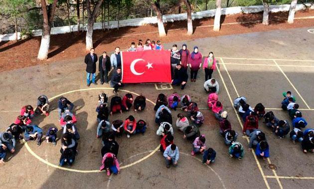 Denizli'nin Beyağaç ilçesinde ortaokul öğrencileri, Zeytin Dalı Harekâtı'na destek için okul bahçesinde bedenleriyle 'Afrin' yazıp, Türk bayrağı açtı.